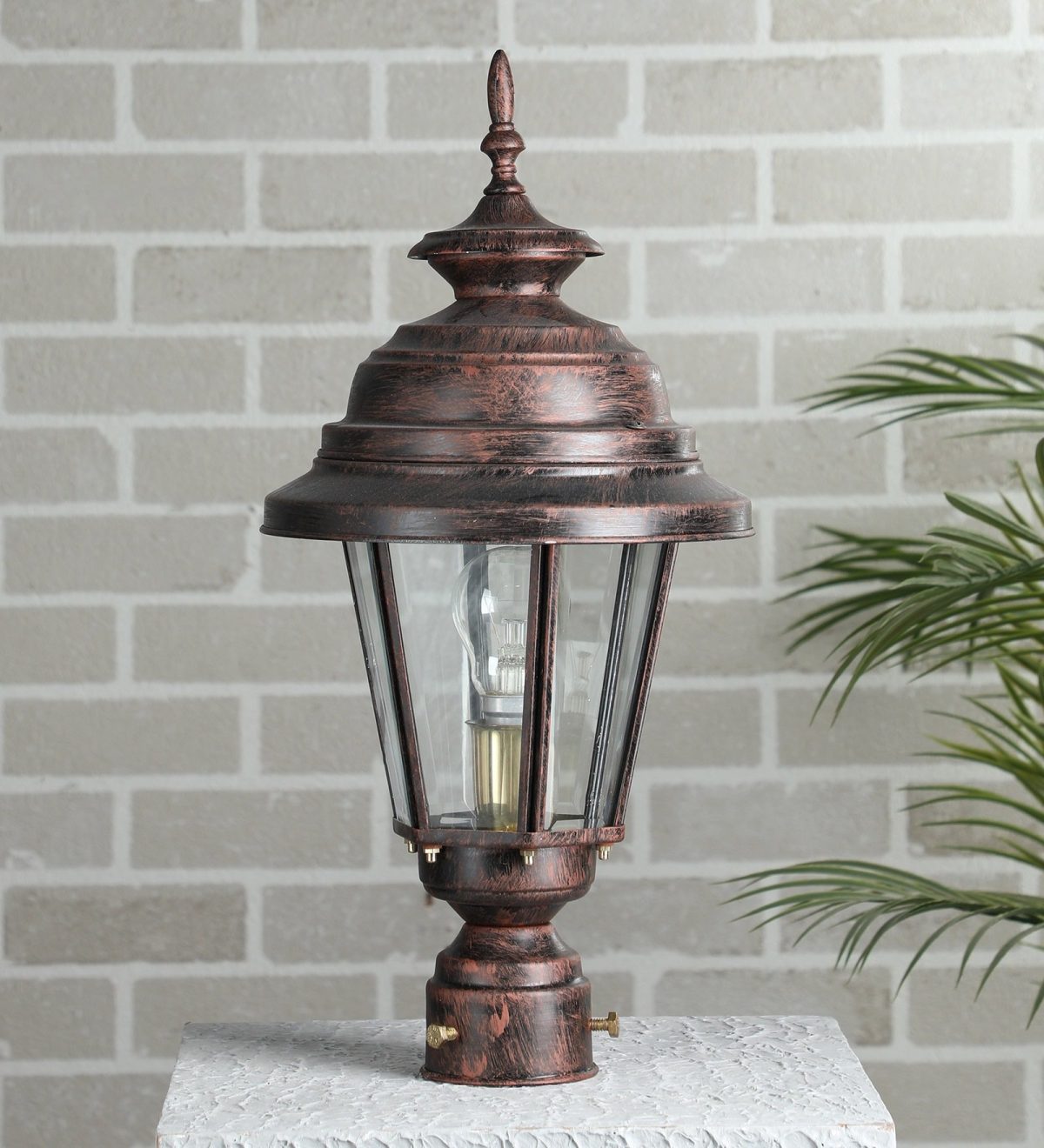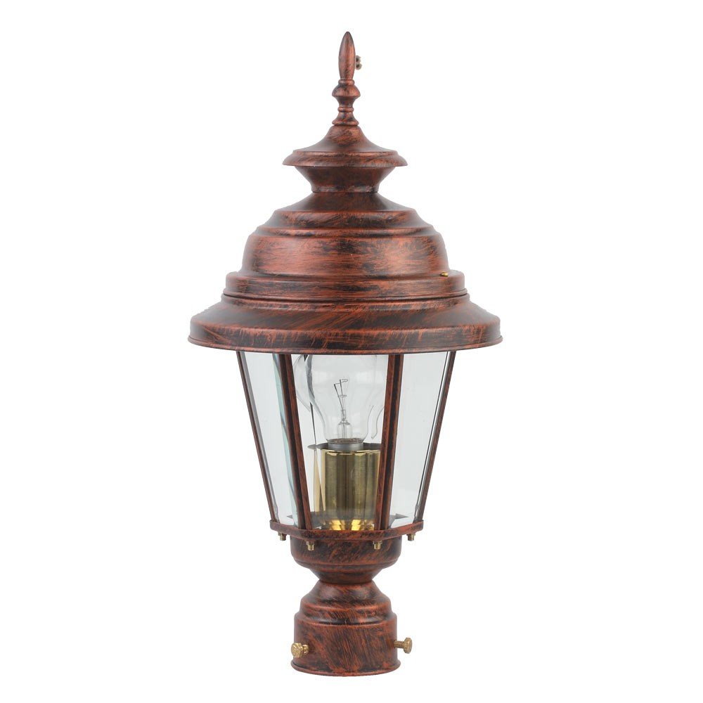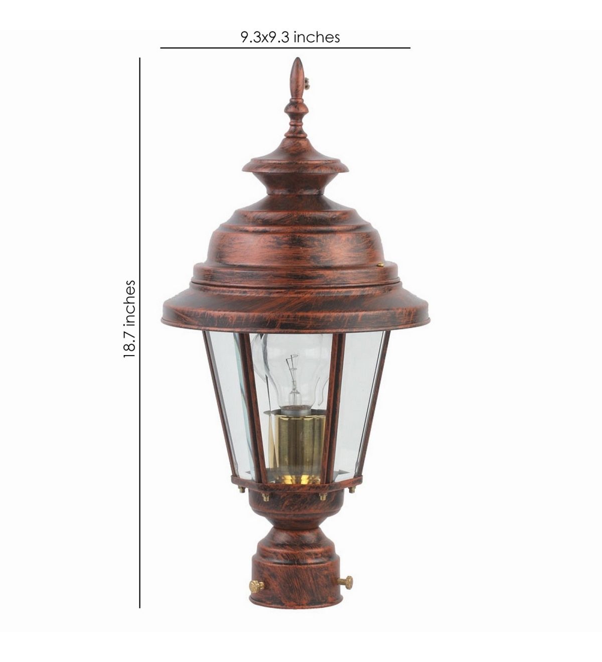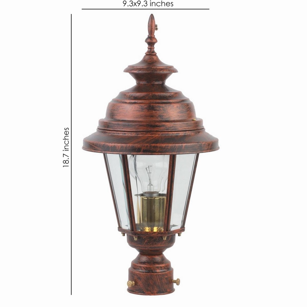 Traditional aluminium sheet, export quality gate pillar post light in attractive copper finish. It is maintenance free, comes with an B22 holder, only the change of lamp is required, which is available locally everywhere You can of course swap out the bulb for one that is dimmable, has a higher light output or a different color temperature. IP 54 rated, providing protection from sprayed water in any direction and making this light perfect for use outdoors. Application areas include building entrance, on top of terrace walls, terrace gardens, boundary walls, open parking, stilt parking. Available in two sizes with code of smaller size as GL4761.