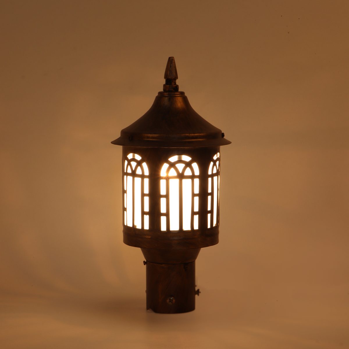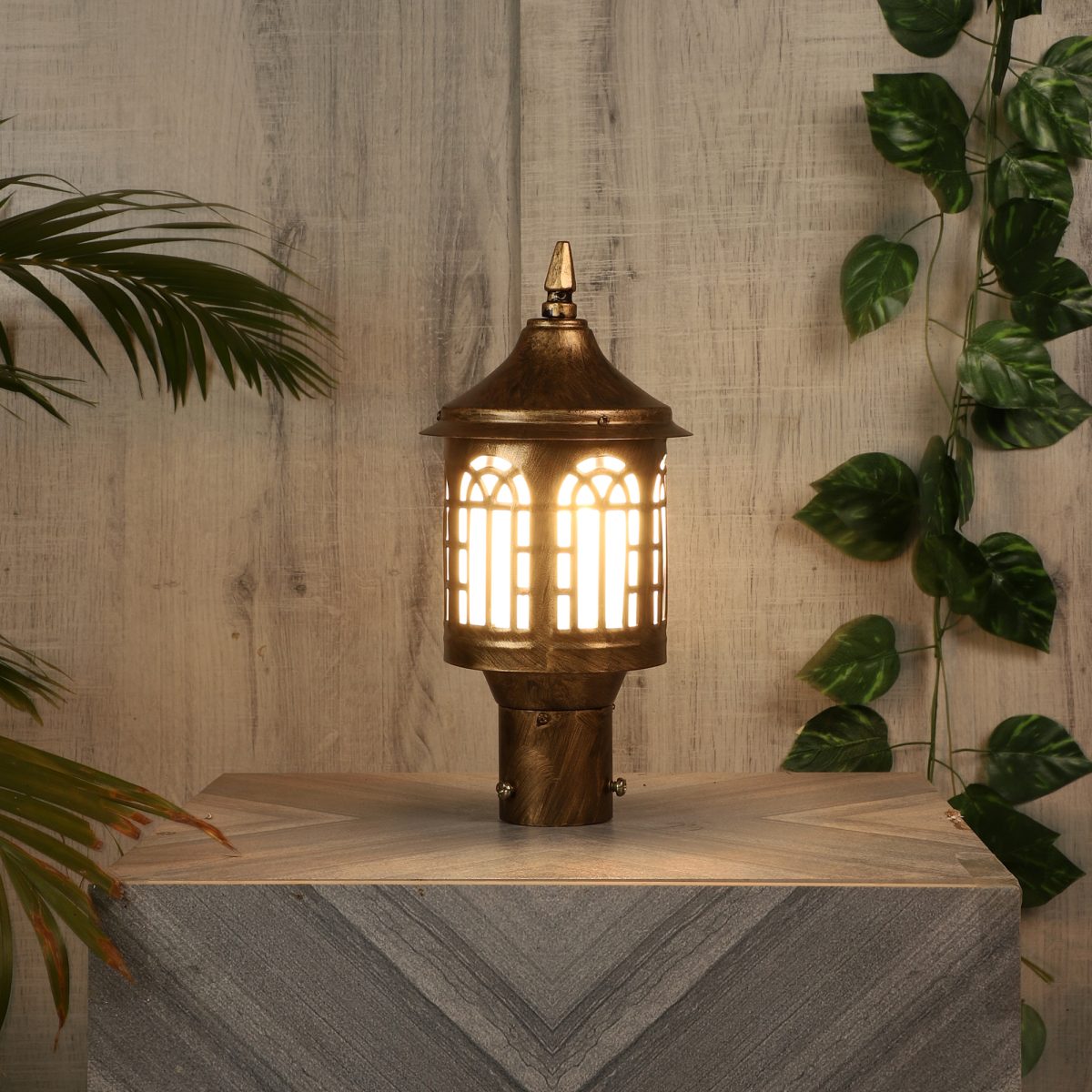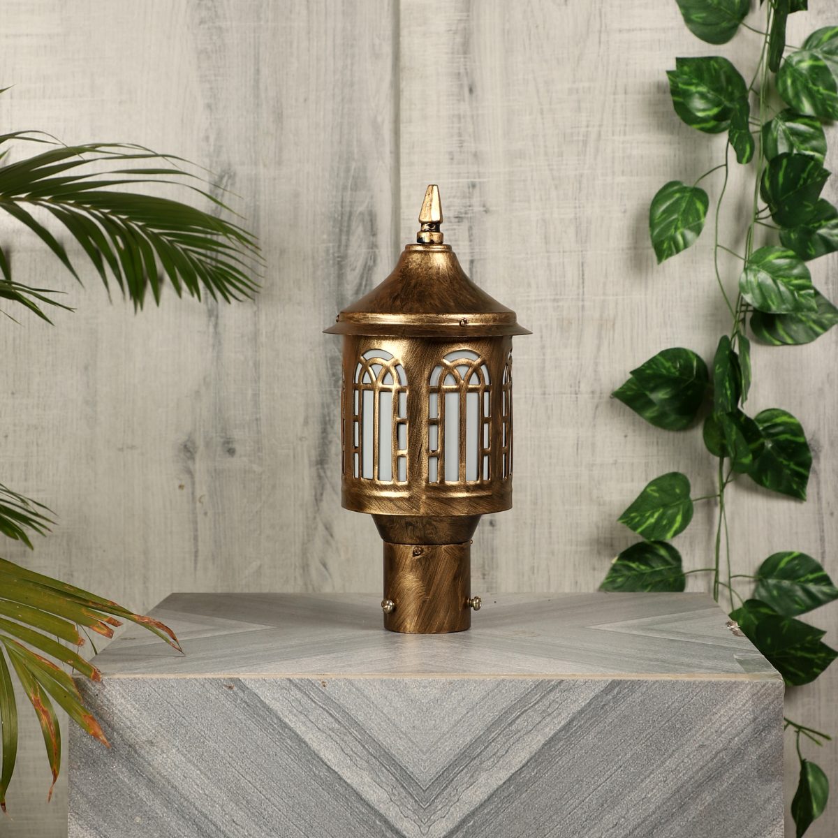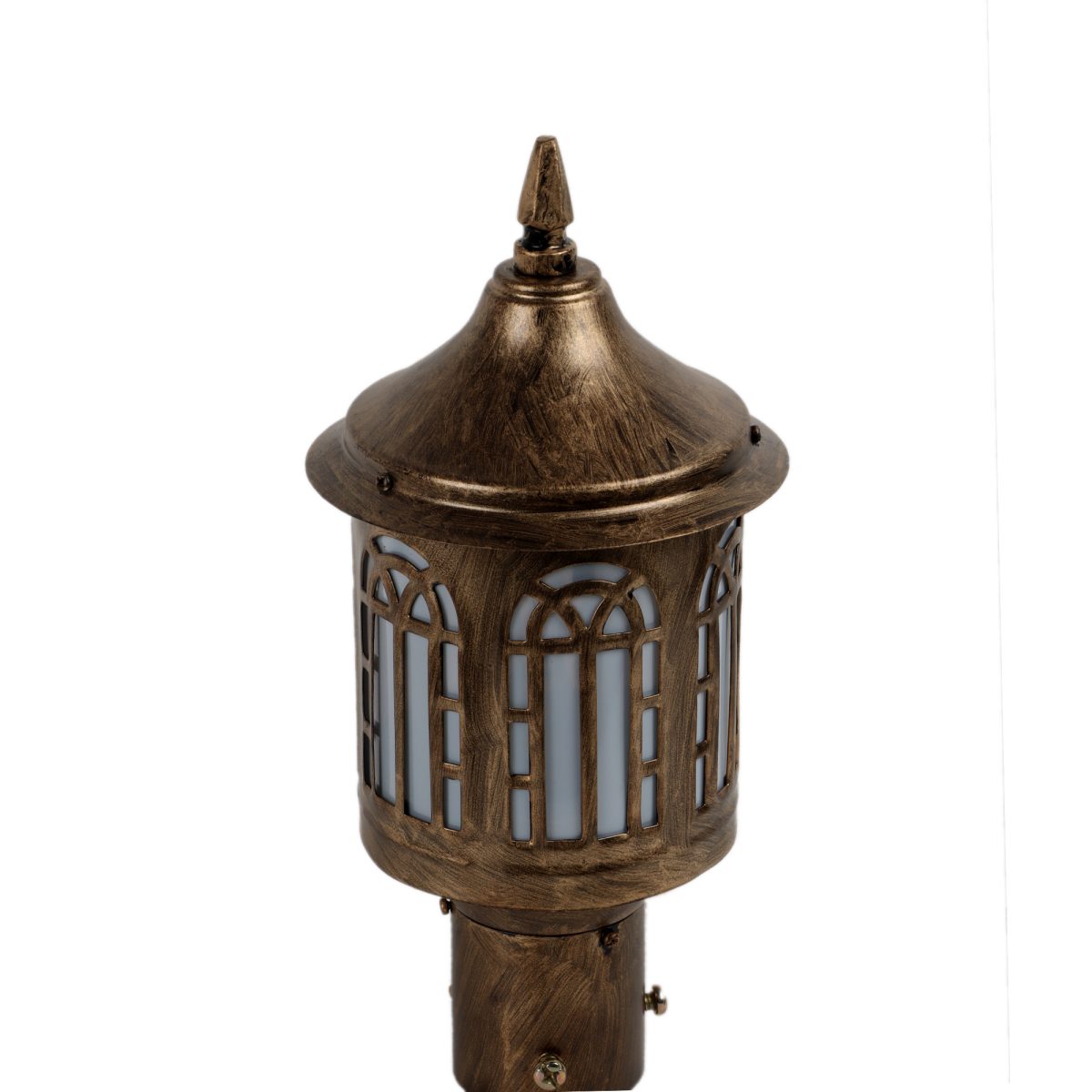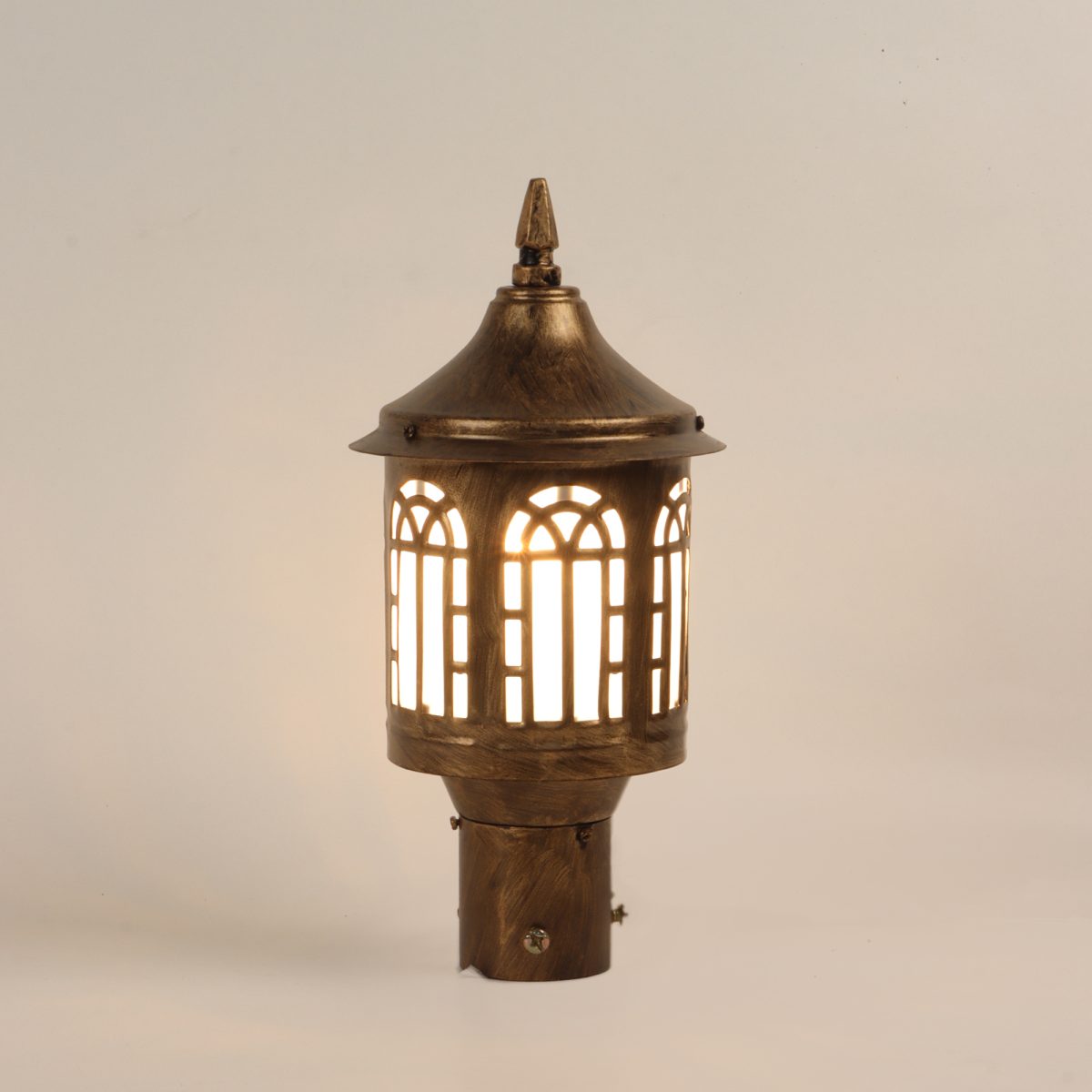 Traditional, mild steel economic gate pillar post light in antique gold finish. It is maintenance free, comes with an B22 holder, only the change of lamp is required, which is available locally everywhere. You can of course swap out the bulb for one that is dimmable, has a higher light output or a different color temperature. IP 54 rated, providing protection from sprayed water in any direction and making this light perfect for use outdoors. Application areas include building entrance, on top of terrace walls, terrace gardens, boundary walls, open parking, stilt parking. Also available in black and green finish.