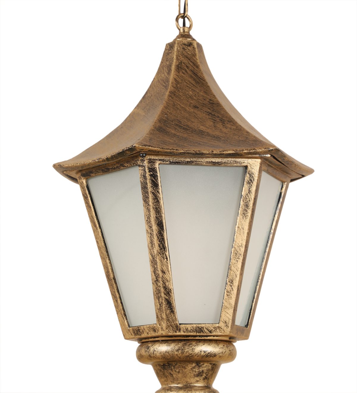 Traditional heavy duty aluminium die cast, premium one of top selling export quality outdoor hanging light in antique gold finish. It is maintenance free, comes with an B22 holder, only the change of lamp is required, which is available locally everywhere. There are many designs in a variety of finishes many of which are part of a family that go with other garden lights. .Application areas include building entrance passage, porch, terrace gardens, theme restaurants and bars, farm house, party venues, gazebo. Can be installed indoors also it it matches with the interiors.Matching Gate Light -GL4774-M, GL4583-S, GL4583-L Matching wall light – WL1833, WL1857, WL1003, WL2650. Matching Bollard code – K1077. All design available in black colour also. LAMP NOT INCLUDED.
