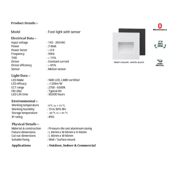 SUPERSCAPE premium aluminium white finish 3 watt IP65 motion sensor foot light concealed for outdoor and indoor.