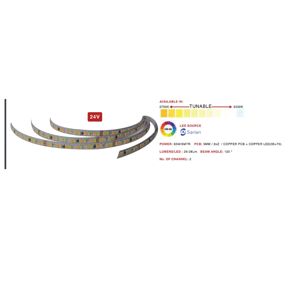 Ultra premium 2025 24V 280 LED per meter strip 65 watt 5 mm colour changing tunable 5 meter roll without driver.