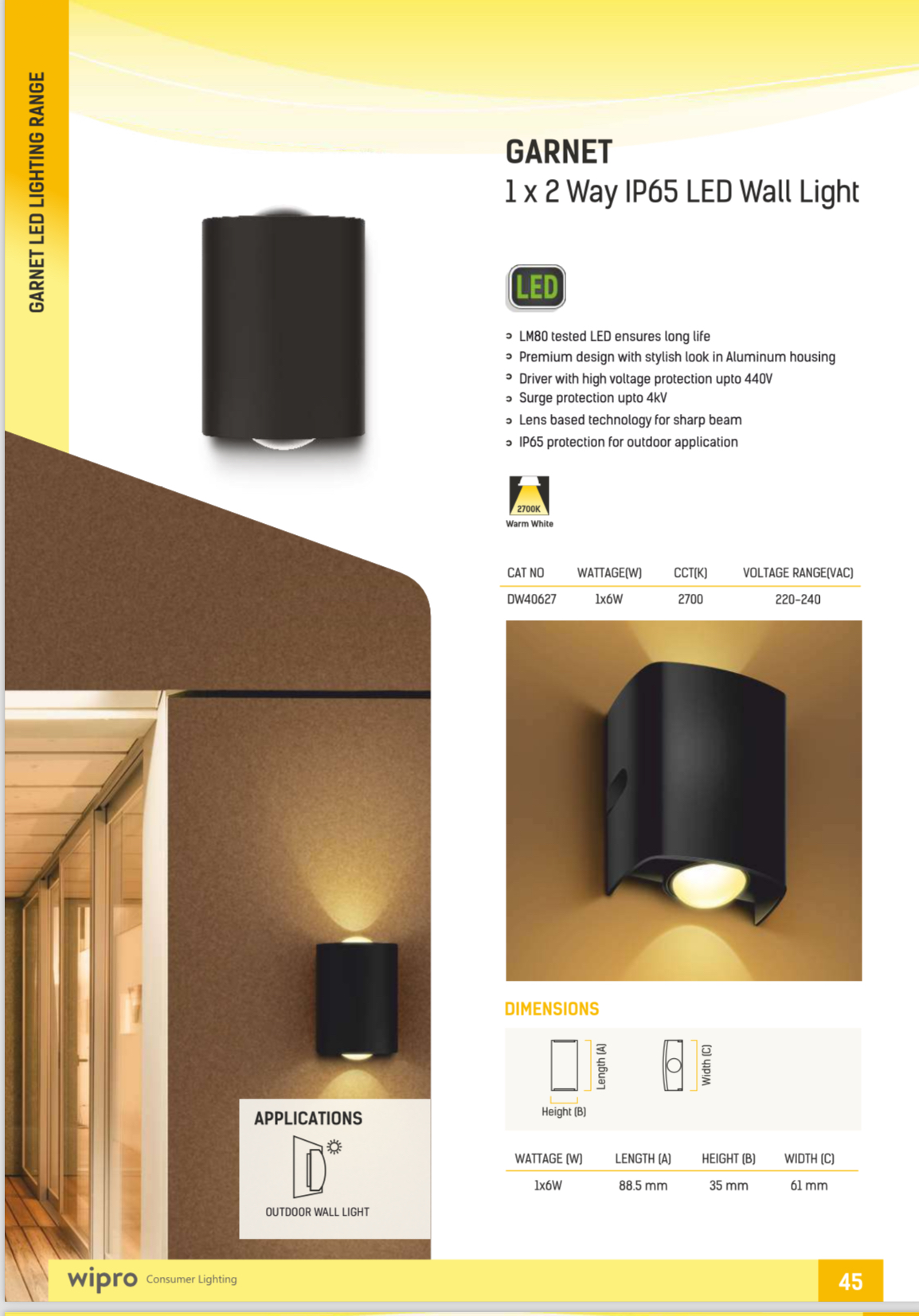 Wipro Garnet 1 x 2 way 6 watt IP65 LED wall Light