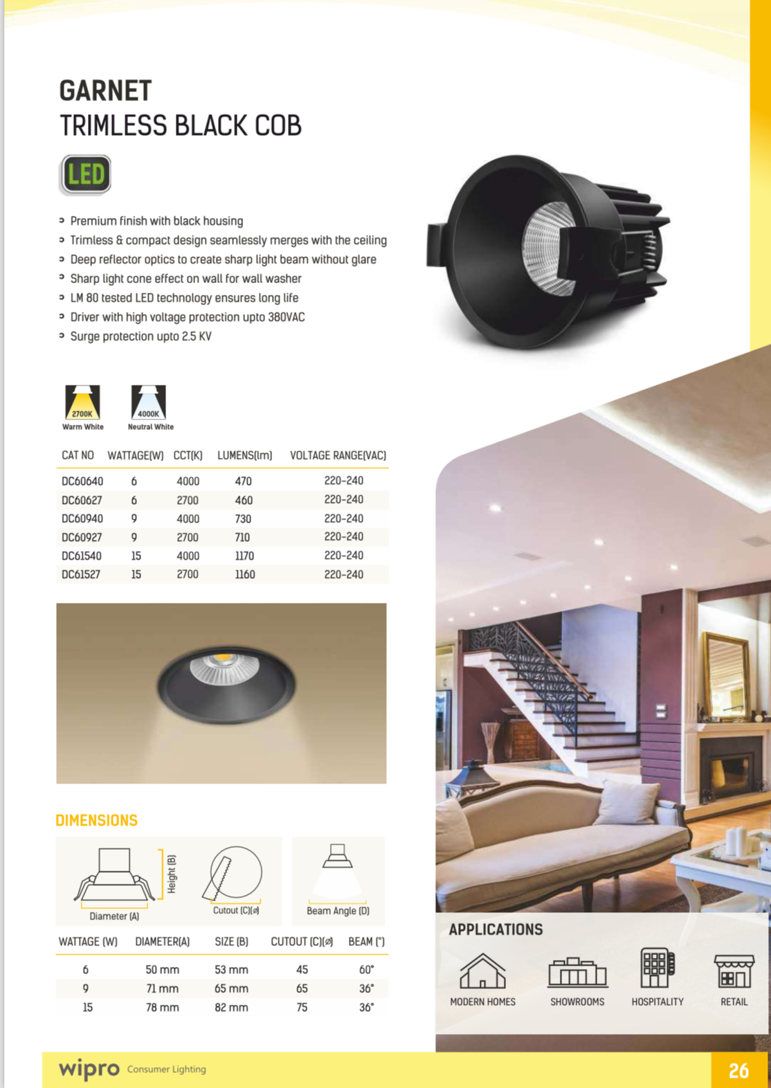 Wipro Garnet 15 watt trimless black COB down light 2700K