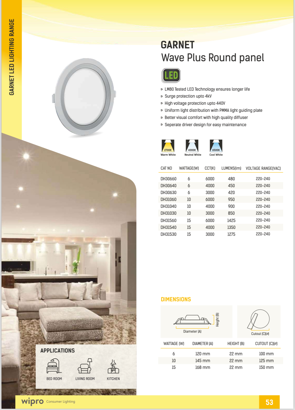 Wipro Garnet Wave Plus 6 watt round LED panel light 4000K WP1386 Wipro Garnet Wave Plus 6 watt round LED panel light 4000K WP1386 Original price was: ₹650.Current price is: ₹288. Inc. GST